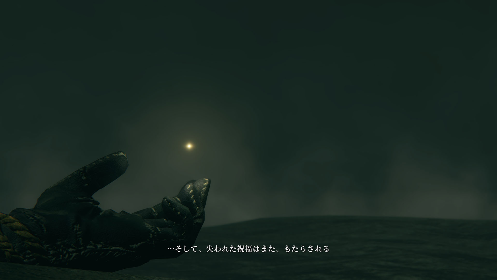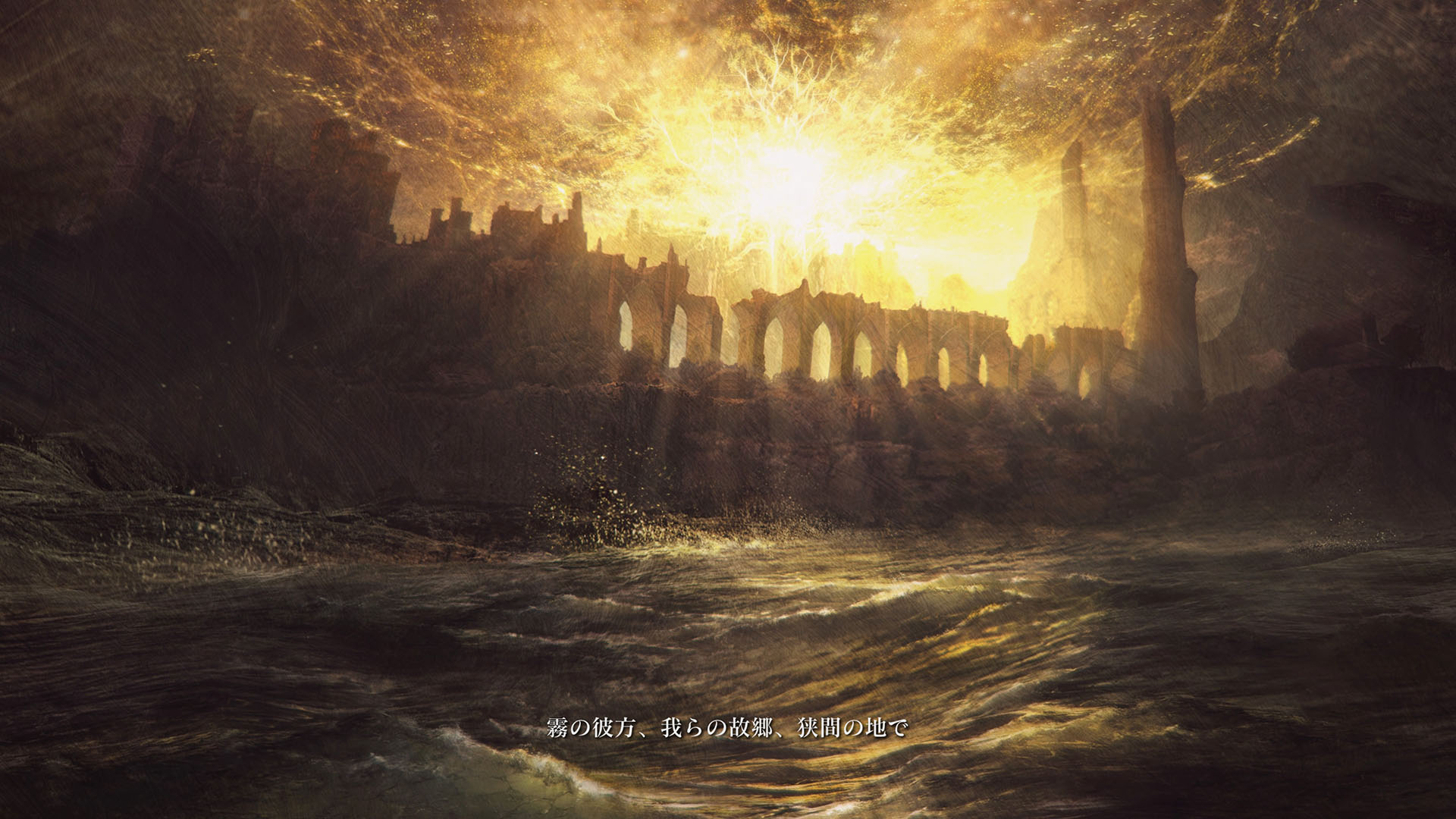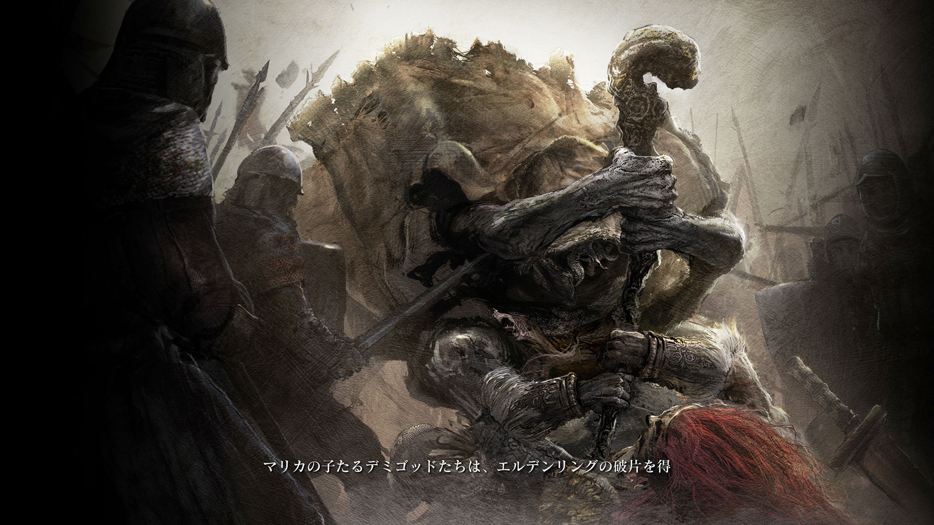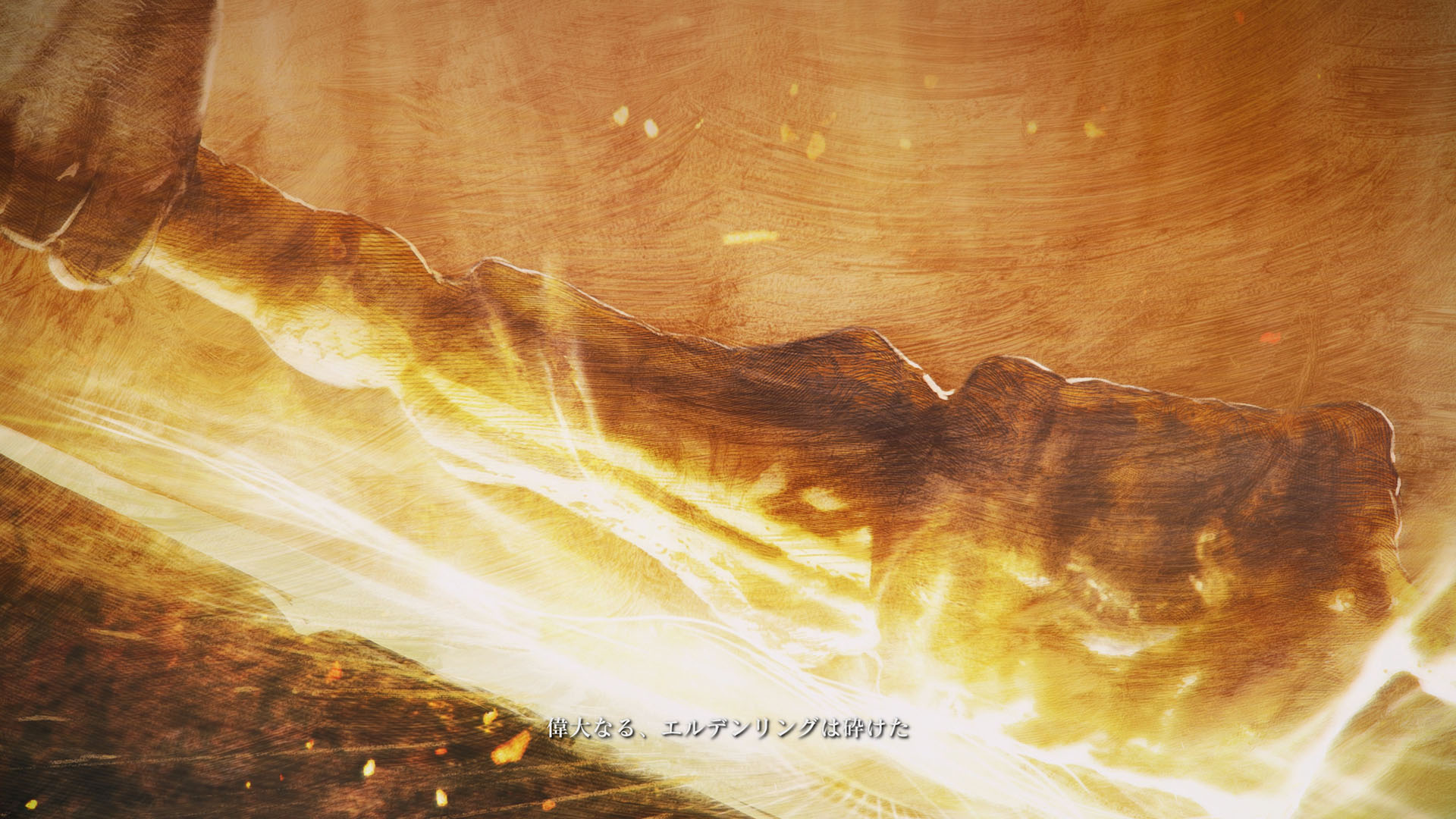 | …落ちた葉が伝えている 偉大なる、エルデンリングは砕けた 霧の彼方、我らの故郷、狭間の地で 永遠の女王マリカは隠れ 黒き刃の陰謀の夜、黄金のゴッドウィンが最初に死んだ マリカの子たるデミゴッドたちは、エルデンリングの破片を得 その力に歪み、狂い、破砕戦争を起こし… 大いなる意志に、見放された 未だ死にきれぬ、死者たちよ 遠い昔に失くした祝福が、我らを呼ぶ 蛮地の王、ホーラ・ルーよ 輝ける金仮面よ 死衾の乙女、フィアよ 忌まわしき糞喰いよ 百智卿、ギデオン=オーフニールよ …そして、失われた祝福はまた、もたらされる まだ名も無き、褪せ人の元に 霧の彼方に向かい、狭間の地に至り エルデンリングに見えよ |