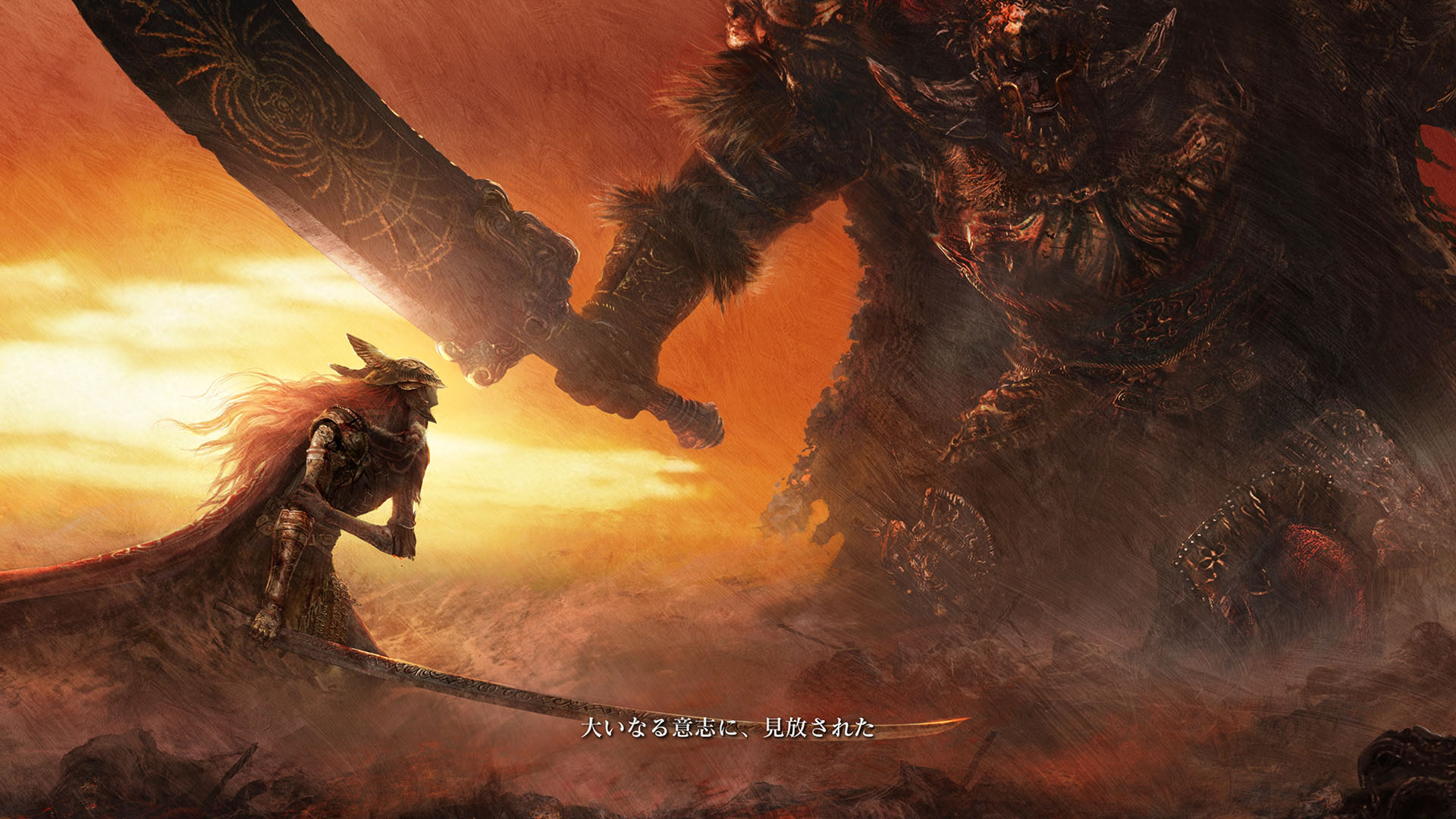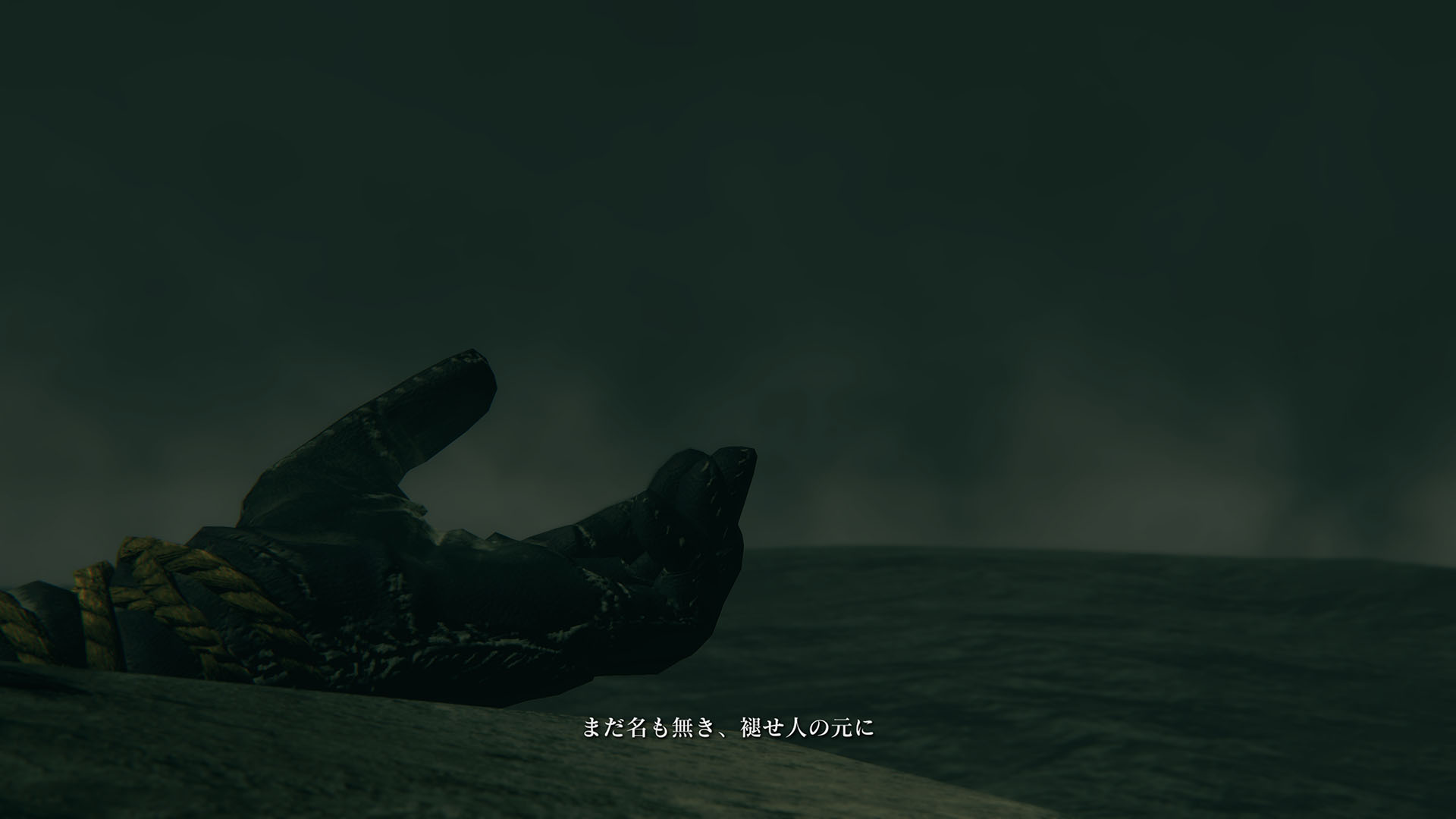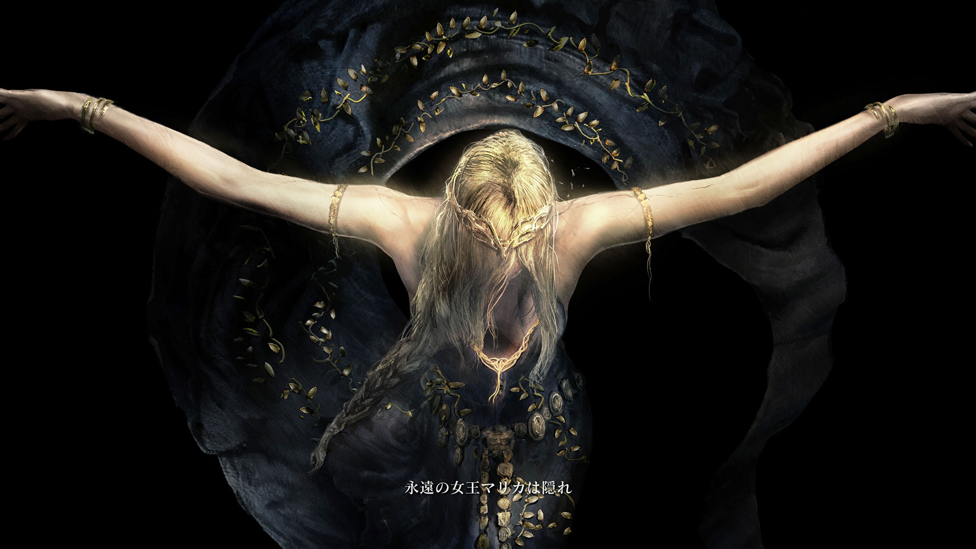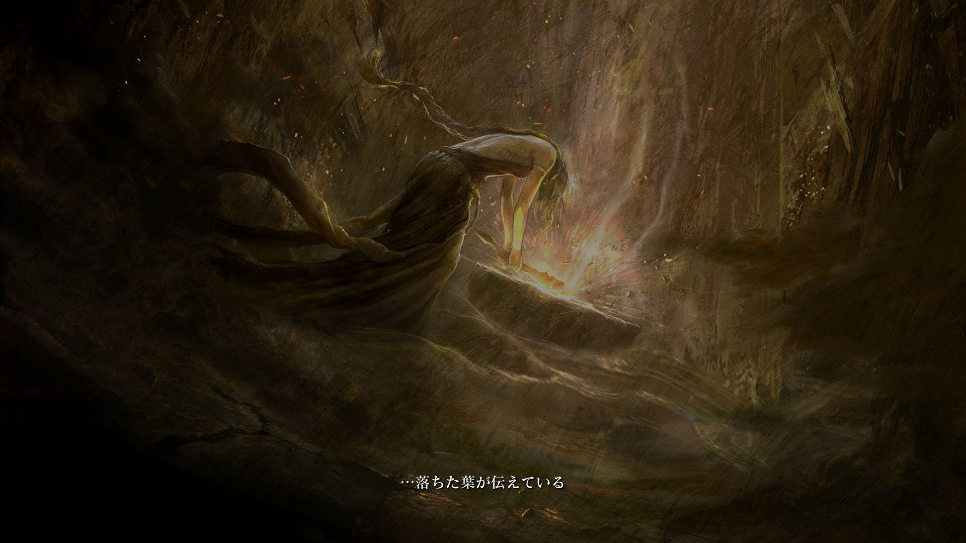 | …落ちた葉が伝えている 偉大なる、エルデンリングは砕けた 霧の彼方、我らの故郷、狭間の地で 永遠の女王マリカは隠れ 黒き刃の陰謀の夜、黄金のゴッドウィンが最初に死んだ マリカの子たるデミゴッドたちは、エルデンリングの破片を得 その力に歪み、狂い、破砕戦争を起こし… 大いなる意志に、見放された 未だ死にきれぬ、死者たちよ 遠い昔に失くした祝福が、我らを呼ぶ 蛮地の王、ホーラ・ルーよ 輝ける金仮面よ 死衾の乙女、フィアよ 忌まわしき糞喰いよ 百智卿、ギデオン=オーフニールよ …そして、失われた祝福はまた、もたらされる まだ名も無き、褪せ人の元に 霧の彼方に向かい、狭間の地に至り エルデンリングに見えよ |