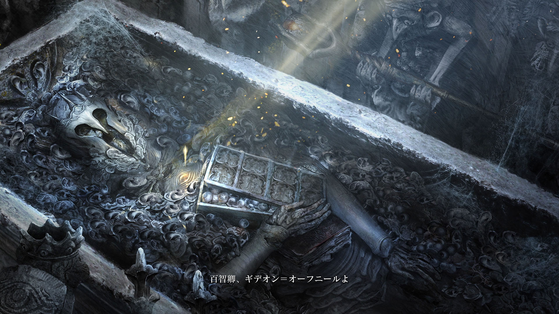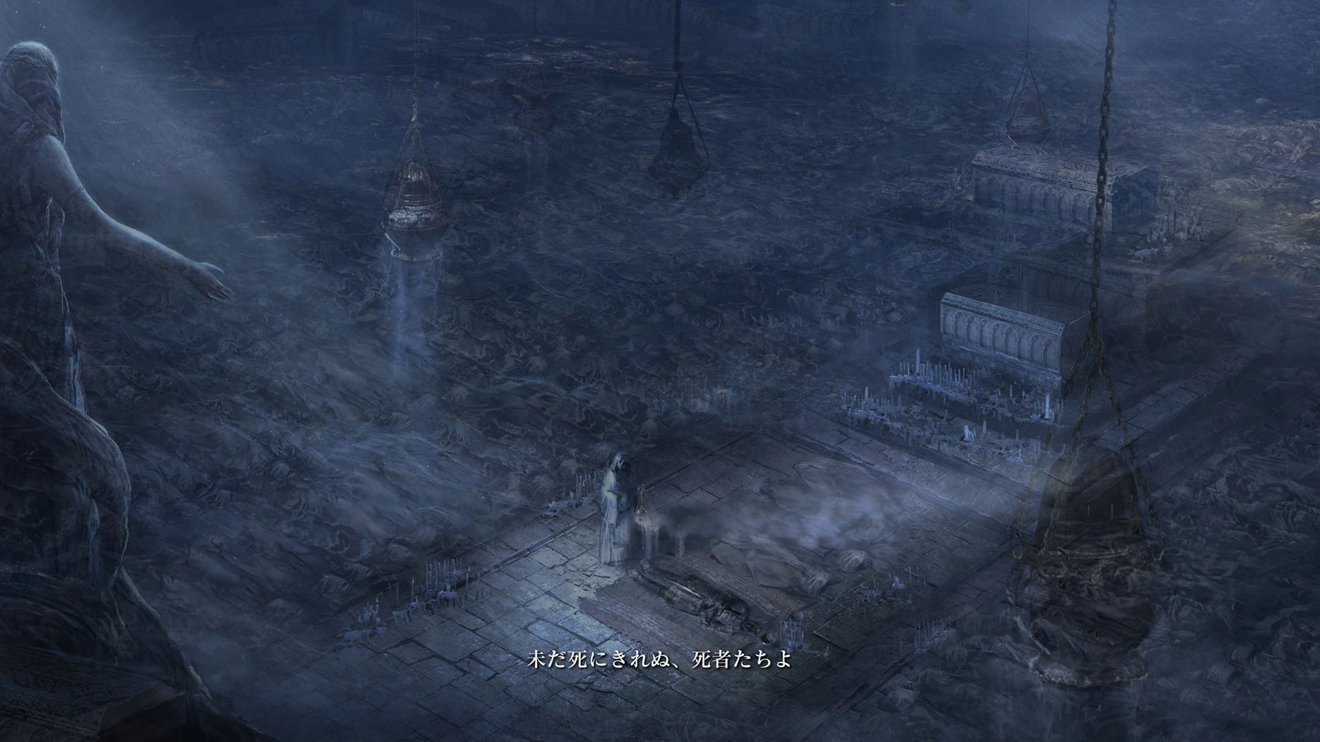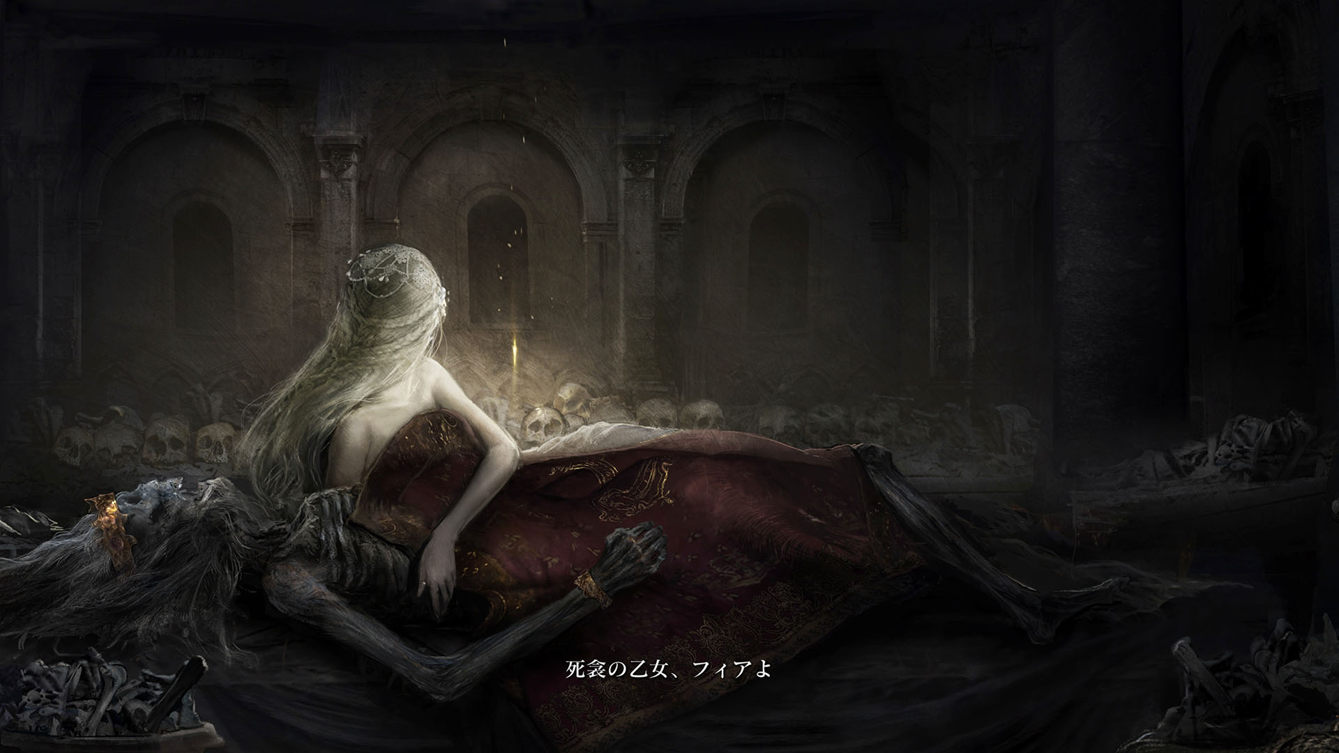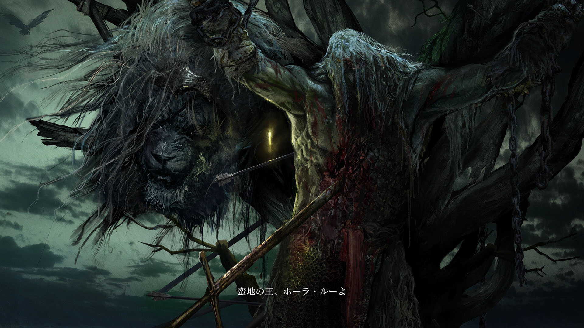 | …落ちた葉が伝えている 偉大なる、エルデンリングは砕けた 霧の彼方、我らの故郷、狭間の地で 永遠の女王マリカは隠れ 黒き刃の陰謀の夜、黄金のゴッドウィンが最初に死んだ マリカの子たるデミゴッドたちは、エルデンリングの破片を得 その力に歪み、狂い、破砕戦争を起こし… 大いなる意志に、見放された 未だ死にきれぬ、死者たちよ 遠い昔に失くした祝福が、我らを呼ぶ 蛮地の王、ホーラ・ルーよ 輝ける金仮面よ 死衾の乙女、フィアよ 忌まわしき糞喰いよ 百智卿、ギデオン=オーフニールよ …そして、失われた祝福はまた、もたらされる まだ名も無き、褪せ人の元に 霧の彼方に向かい、狭間の地に至り エルデンリングに見えよ |