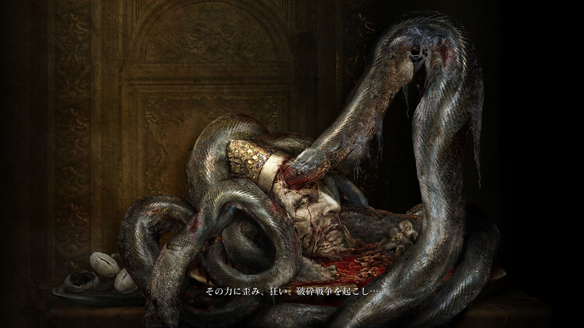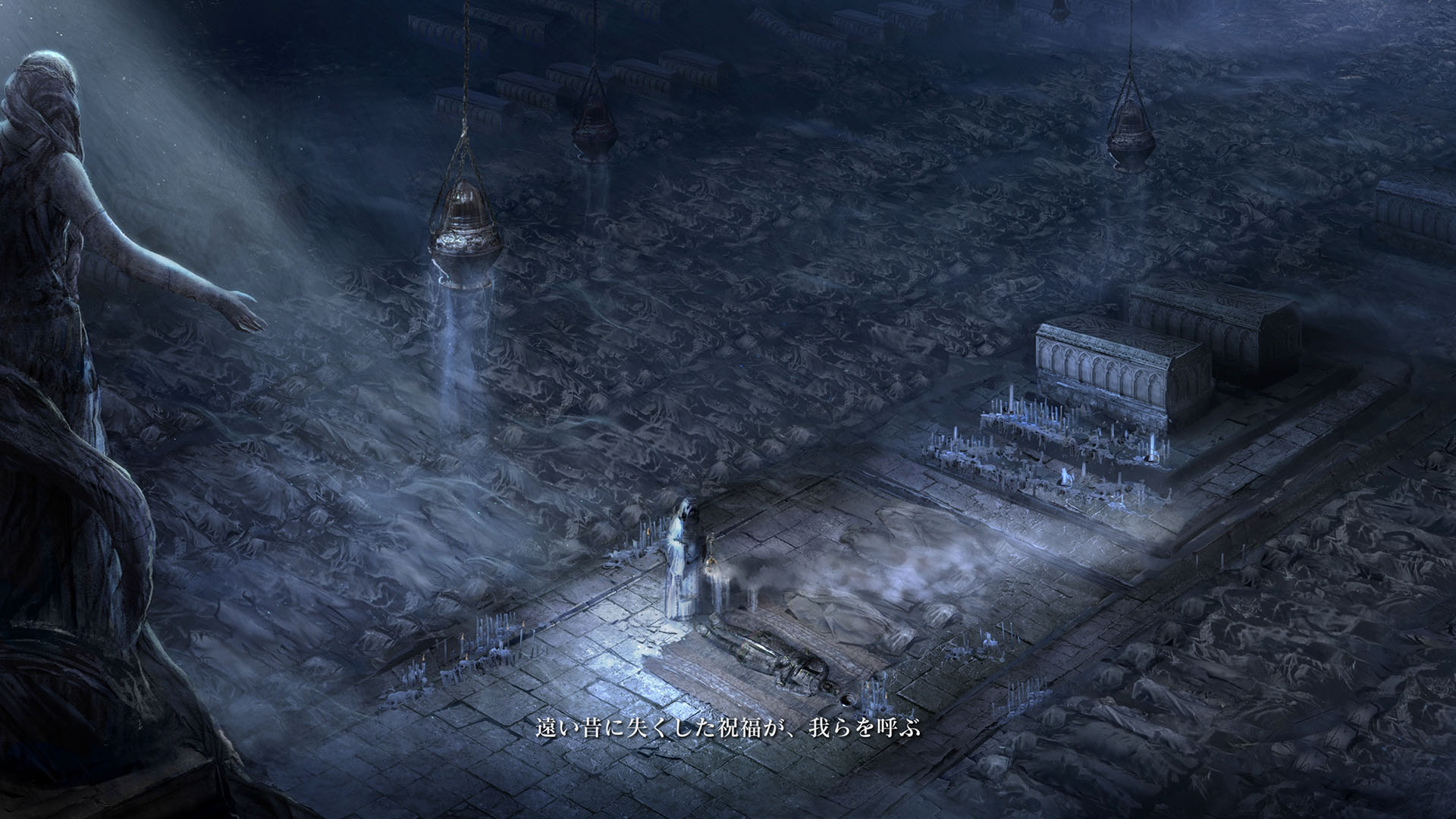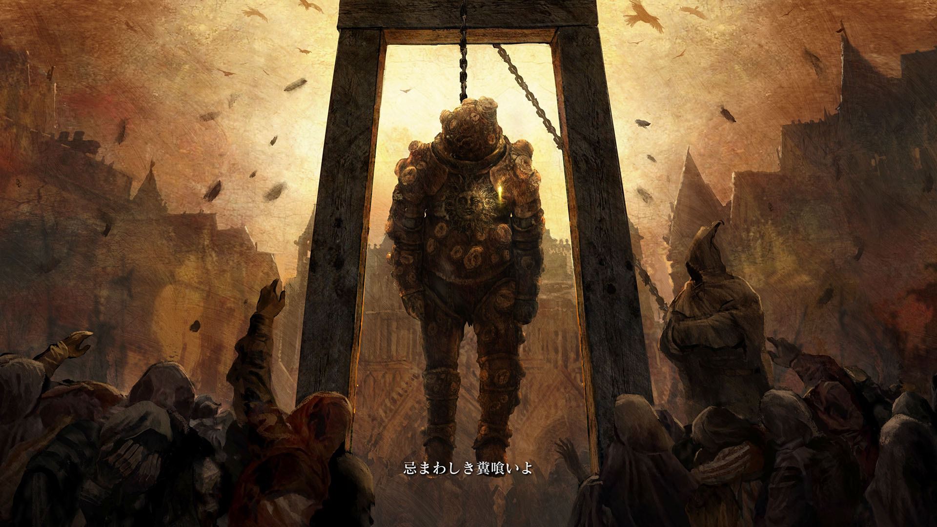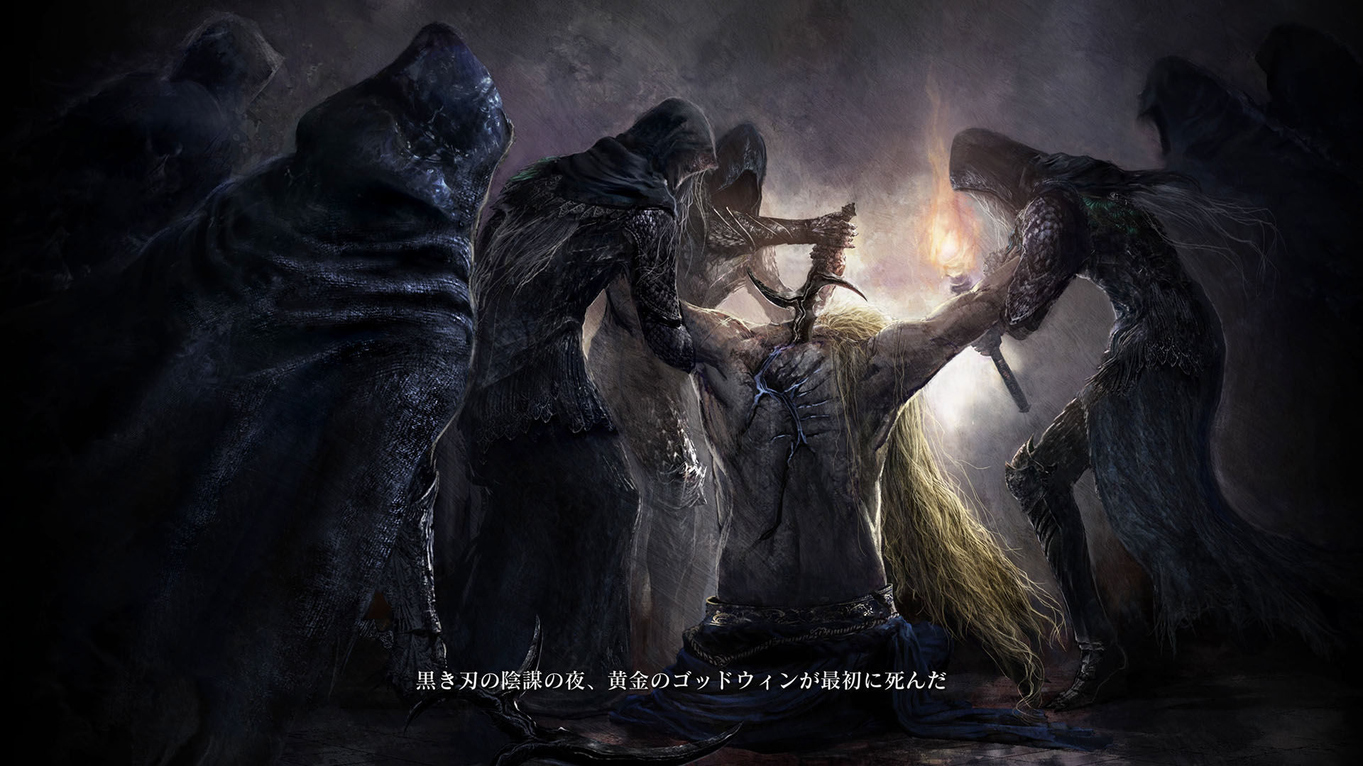 | …落ちた葉が伝えている 偉大なる、エルデンリングは砕けた 霧の彼方、我らの故郷、狭間の地で 永遠の女王マリカは隠れ 黒き刃の陰謀の夜、黄金のゴッドウィンが最初に死んだ マリカの子たるデミゴッドたちは、エルデンリングの破片を得 その力に歪み、狂い、破砕戦争を起こし… 大いなる意志に、見放された 未だ死にきれぬ、死者たちよ 遠い昔に失くした祝福が、我らを呼ぶ 蛮地の王、ホーラ・ルーよ 輝ける金仮面よ 死衾の乙女、フィアよ 忌まわしき糞喰いよ 百智卿、ギデオン=オーフニールよ …そして、失われた祝福はまた、もたらされる まだ名も無き、褪せ人の元に 霧の彼方に向かい、狭間の地に至り エルデンリングに見えよ |