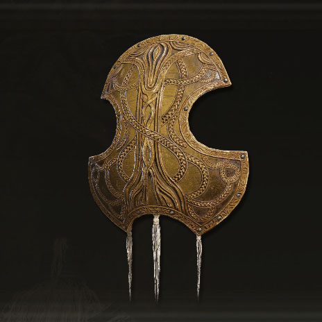| 黄金樹の大盾 | 黄金で作られた、重厚な大盾 ツリーガードと呼ばれる、重騎士の得物 古い守りの祈祷が施されている それは、黄金樹を守る者たち すべてが範とする、城壁の盾である 専用戦技「黄金の返報」 盾を構え、守りの祈祷を解放する戦技 魔術や祈祷を消し去り、黄金の力を返報する |