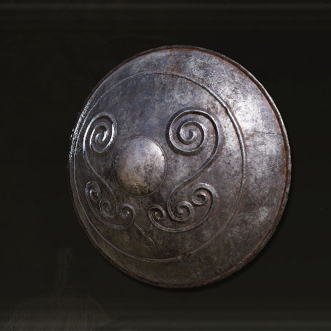 | 青紋のヒーターシールド | 金属製の中盾 カイトシールドに比べ、扱いやすい その紋章は、川と森を示す |